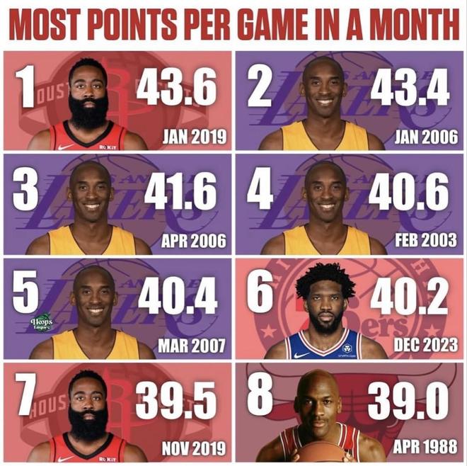 從對(duì)手分布看,哈登與科比的“爆表月份”普遍覆蓋強(qiáng)弱參差的密集賽程,說明其40+并非靠單場(chǎng)頂分“拉均值”,而是長段落的持續(xù)輸出;喬丹的39.0分/場(chǎng)則在慢節(jié)奏、低三分時(shí)代完成,含金量同樣極高;恩比德能在2023年完成中鋒40+,反映出如今“空間+罰球制造+順下終結(jié)”的內(nèi)線三件套已足以對(duì)沖外線高占有的優(yōu)勢(shì)。